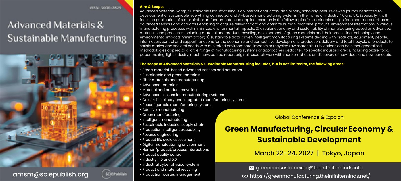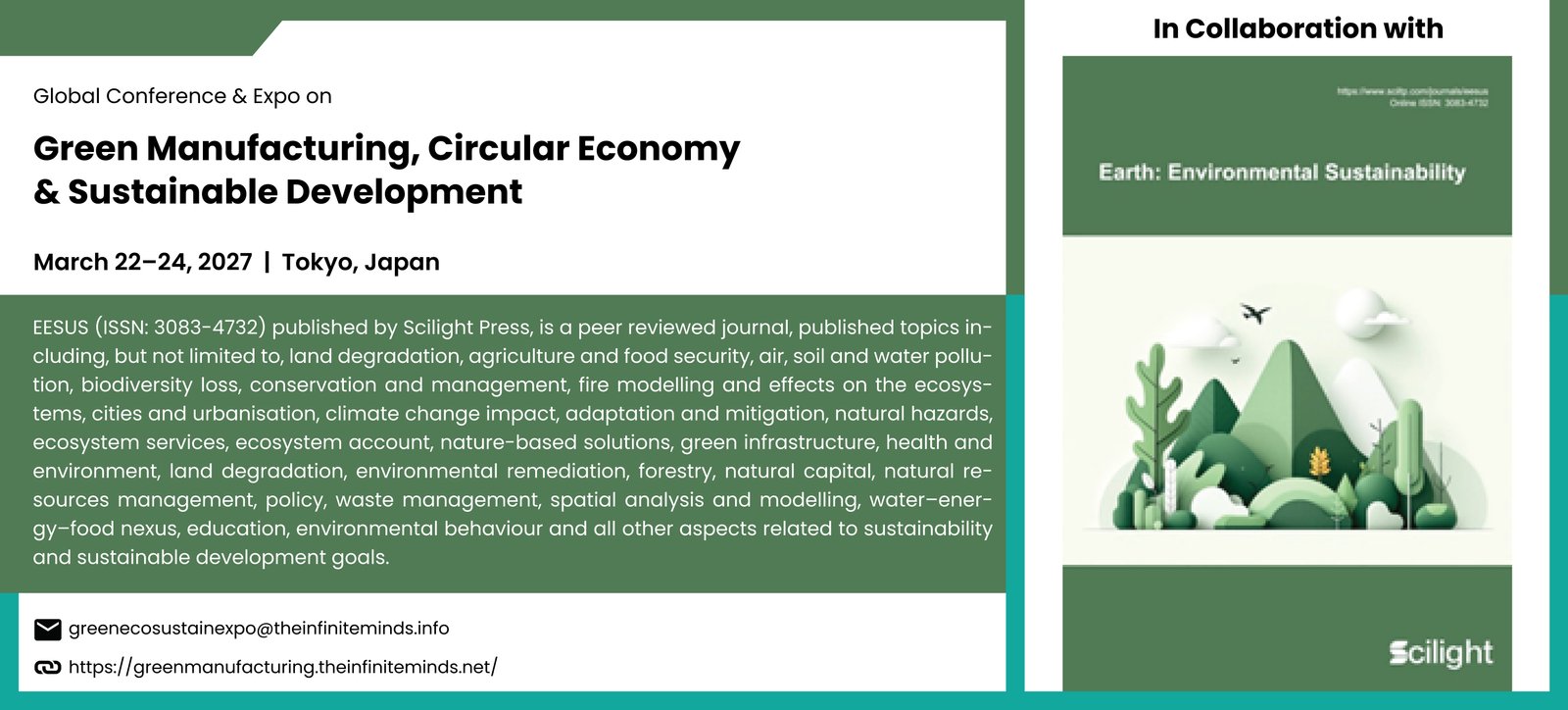 The Global Conference & Expo on Green Manufacturing, Circular Economy and Sustainable Development (GreenEcoSustainExpo-2027) will be held on March 22–24, 2027, in Tokyo, Japan. The conference aims to bring together researchers, scientists, engineers, industry professionals, and academicians from across the globe to discuss cutting-edge research, emerging technologies, and innovative practices in green manufacturing, circular economy, and sustainable development.